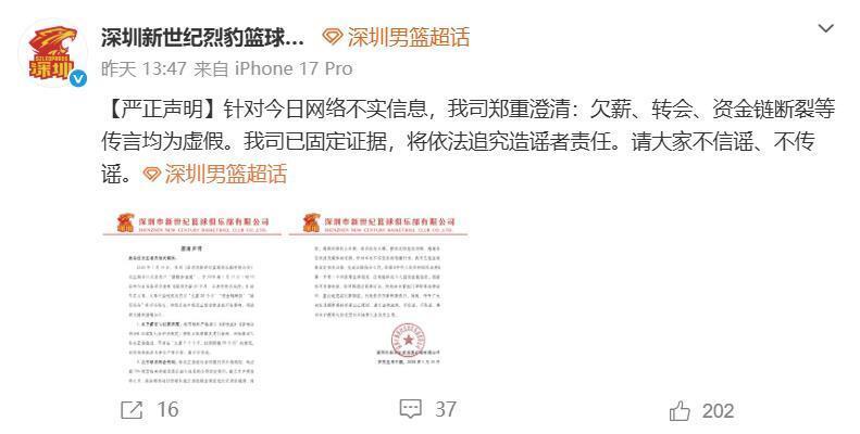 深圳队本赛季战绩不错,目前8胜6负的战绩排名联赛第八,近期还分别战胜了北京首钢、上海队、青岛队等强队,目标直指季后赛,这其中不仅有球员的连续爆发,更大的功劳在于老帅郑永刚指导。不过近期有传闻深圳队出现“球员欠薪、球队可能会交易球员,甚至有球队(俱乐部)资金链断裂,面临破产”等信息,搞得人心惶惶的,对于这些问题深圳市新世纪篮球俱乐部有限公司做出了官方回应。